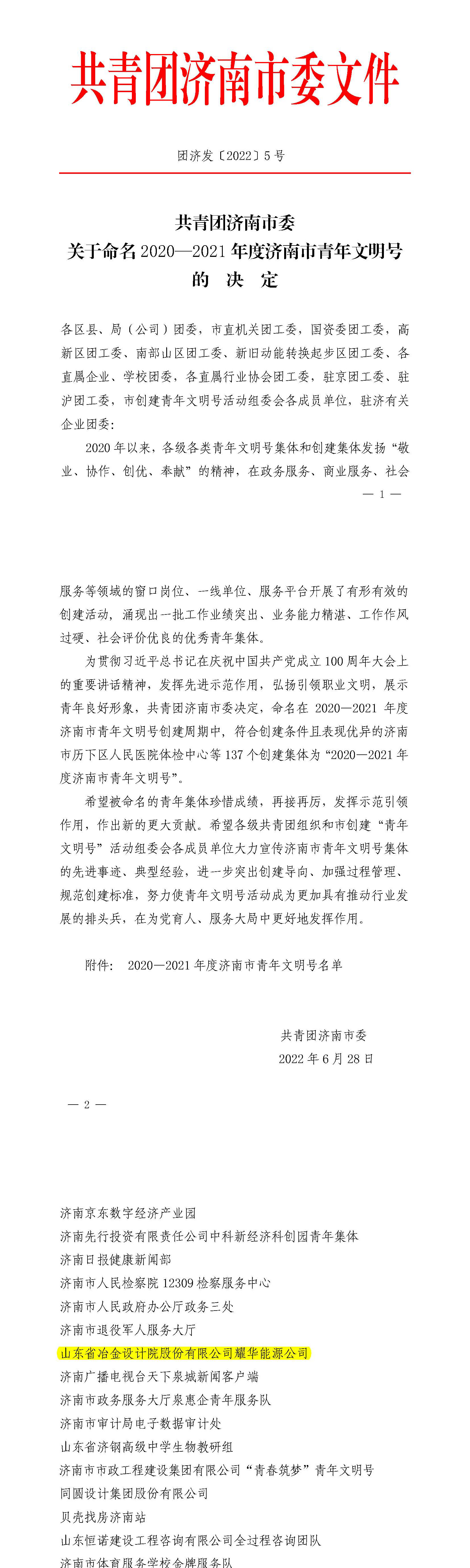2022年6月28日,公司獲得“2020—2021 年度濟南市青年文明號”稱號
