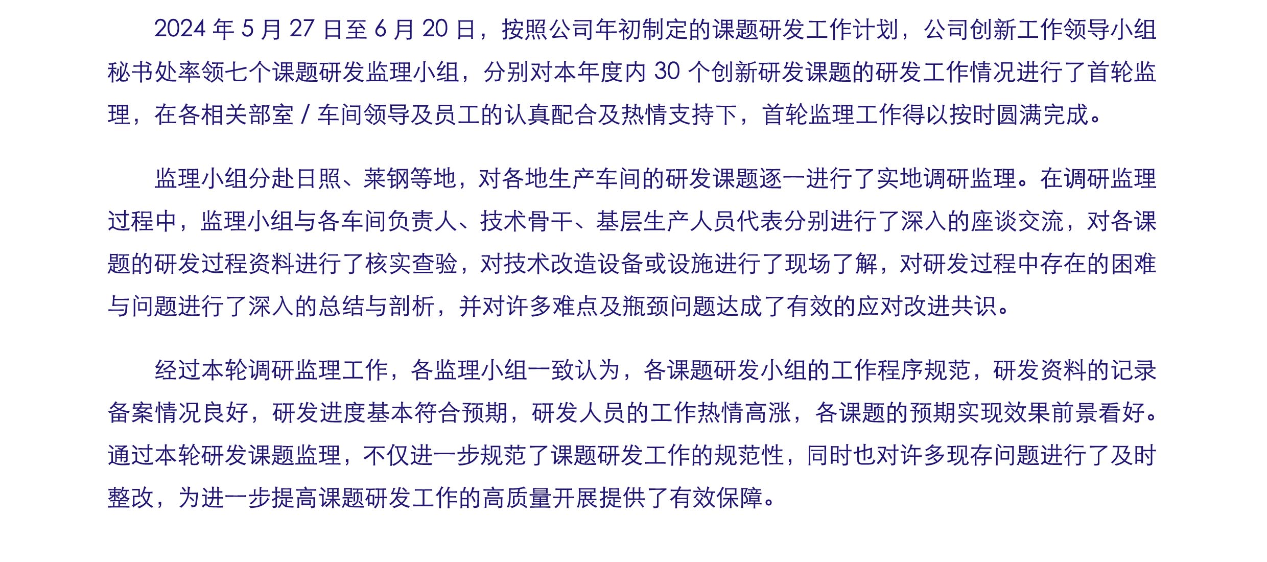 2024年6月,公司2024年度研發(fā)課題的首輪監(jiān)理工作圓滿完成