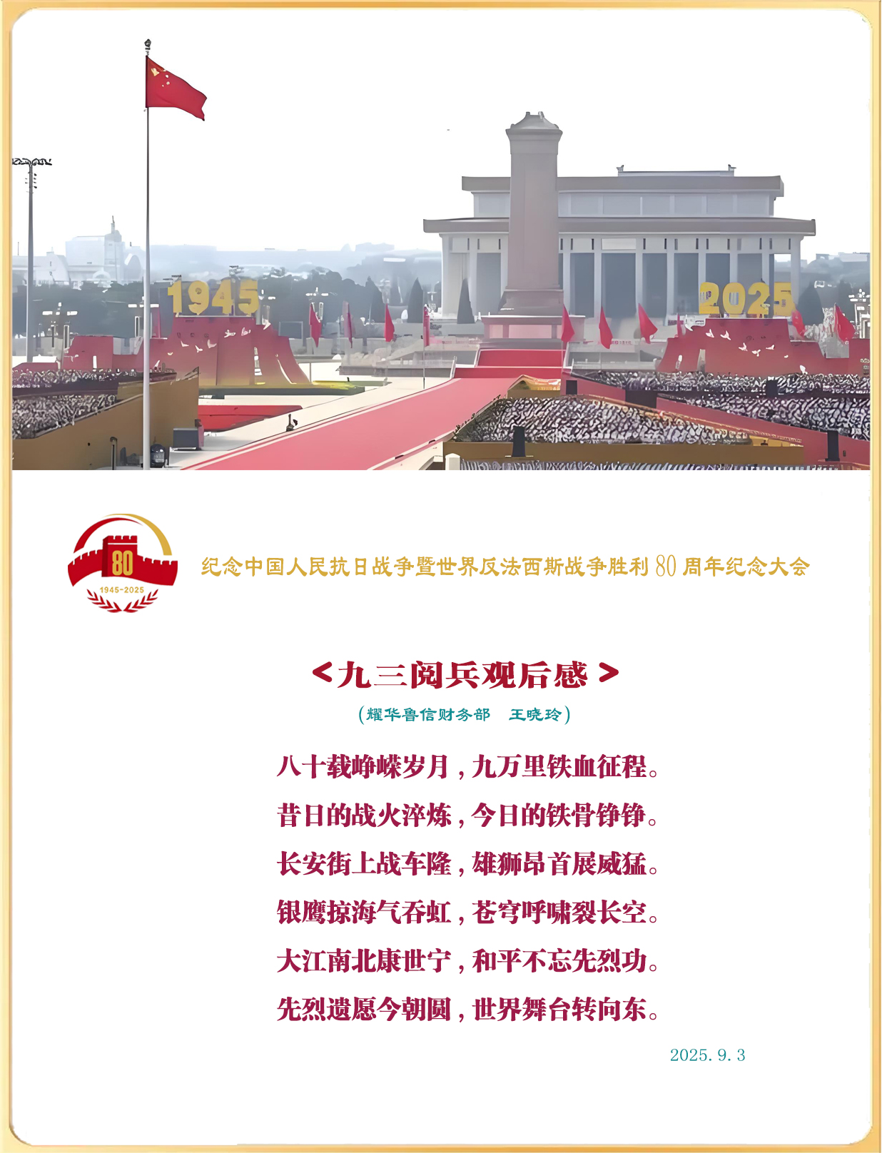 2025年9月,紀(jì)念中國人民抗日戰(zhàn)爭暨世界反法西斯戰(zhàn)爭勝利80周年:員工詩詞《九三閱兵觀后感》