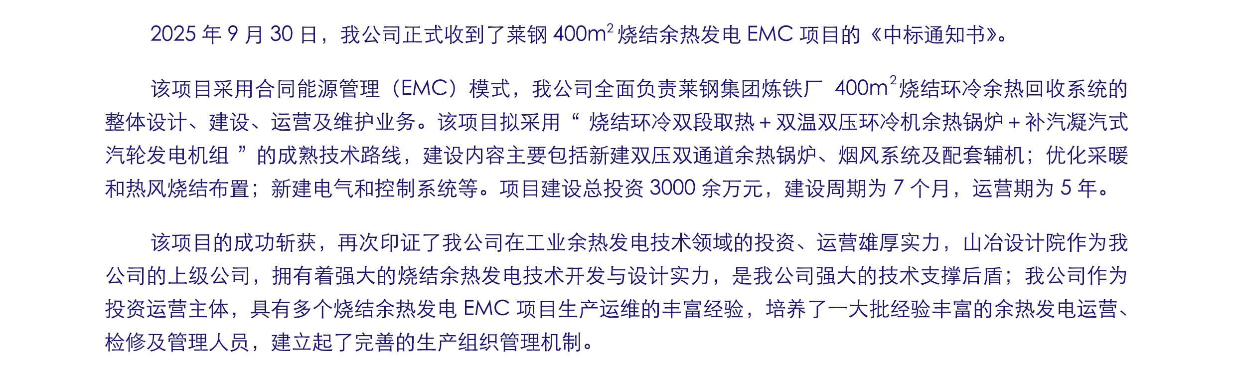 2025年9月30日,公司成功中標萊鋼燒結(jié)余熱發(fā)電EMC項目